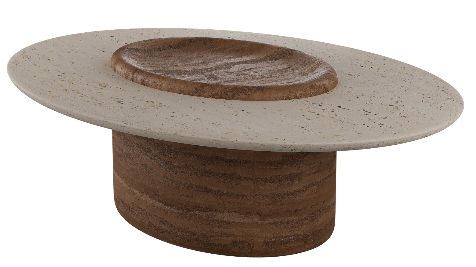 Travertino-Like Composite: A blend of bio-based resin (similar to the legs) with mineral fillers (ground limestone and marble dust) with a water-based sealant to replicate the look and texture of travertino stone.