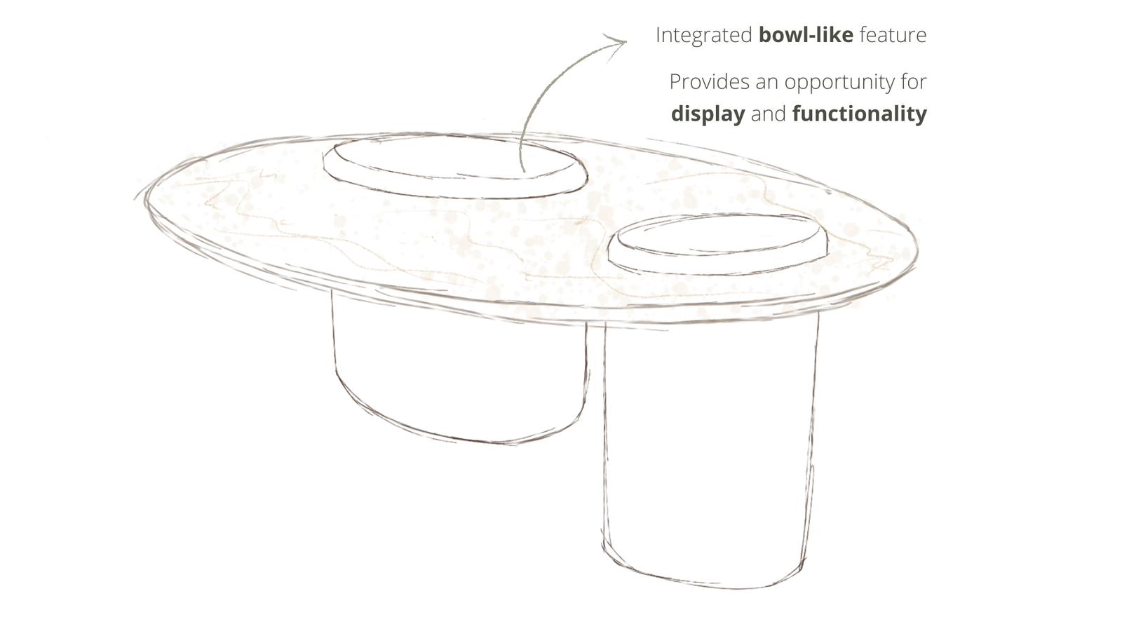 - Anablep : This table represents the Four-eyed Fish’s double pupils. It has two rammed earth legs, one larger for extra support, passing through a large oval travertino-like surface.