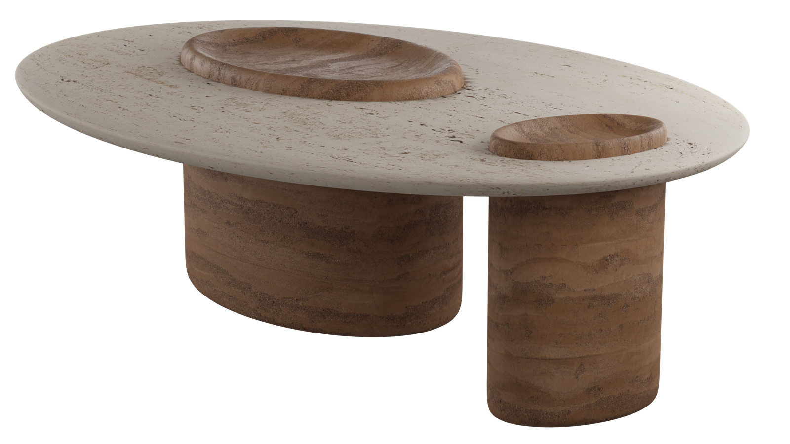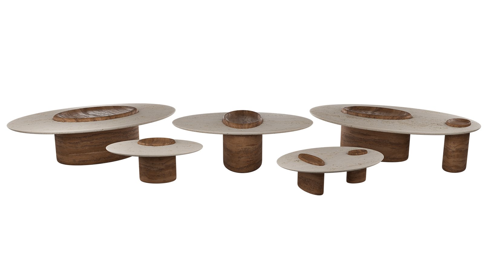 Each piece blends structure and organic curves, with an integrated bowl-like feature on top for display and functionality.