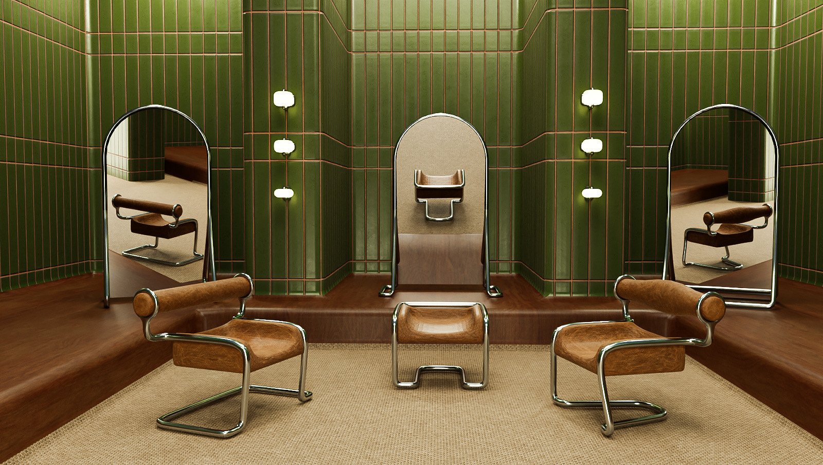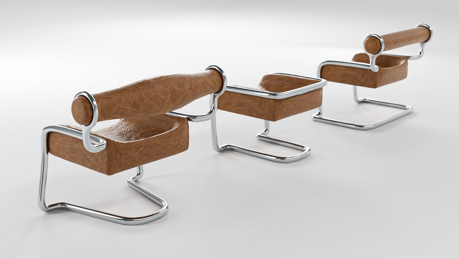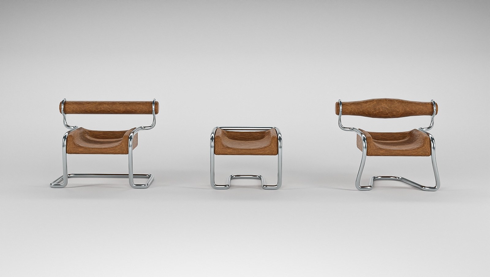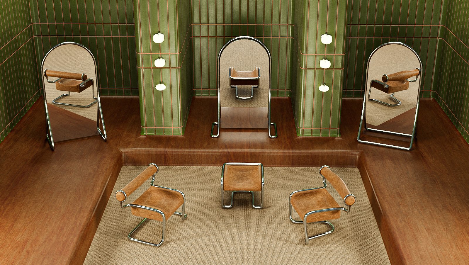 With a functional design, this collection includes chairs, mirrors and lamps, with three variations of each. Utilizing metal tubes, leather, glass and mirror, each piece in this collection is unified by the metal bending style.
