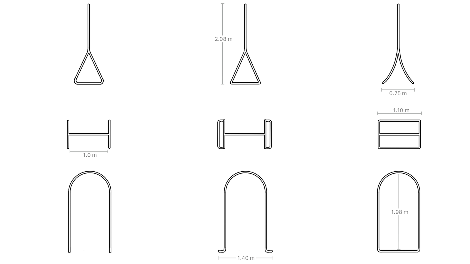 Shaped like an arch, the mirrors have a frame whose top is standardized and vary only at the base. The mirror is securely fixed in the center of the frame, allowing for easy adjustment of the angle of inclination.