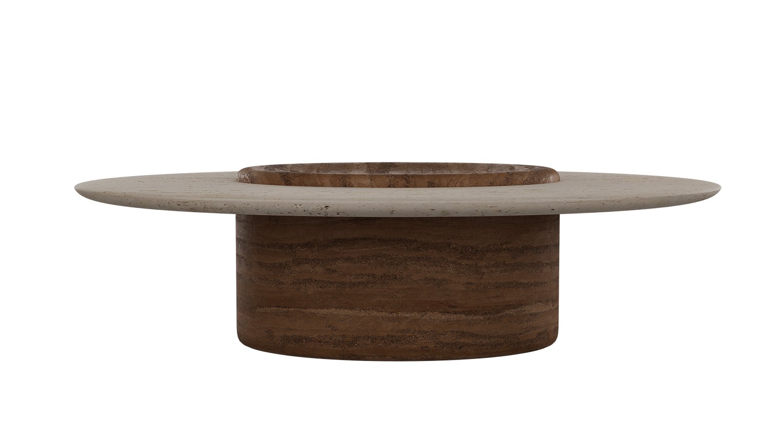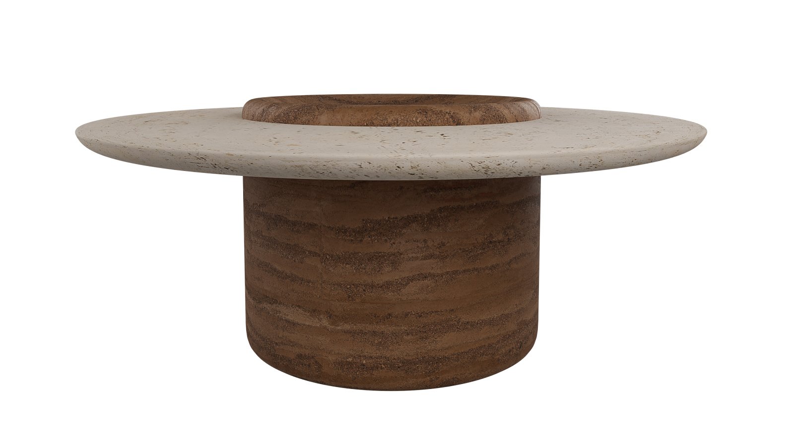 The Capra’s horizontal slit-shaped pupil serves as the inspiration for this piece. The oval travertino-like top is intersected horizontally by a rammed earth centered support structure.