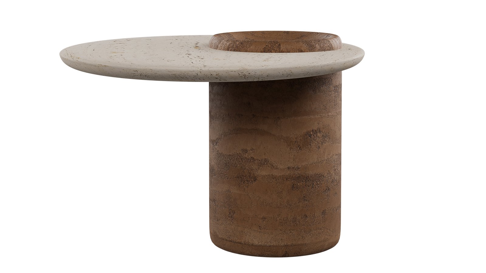 The Eupryma table reflects the animal’s round, pupils. The travertino-like stone top features an oval cutout, where a more rounded rammed earth leg rises through this balanced side table.