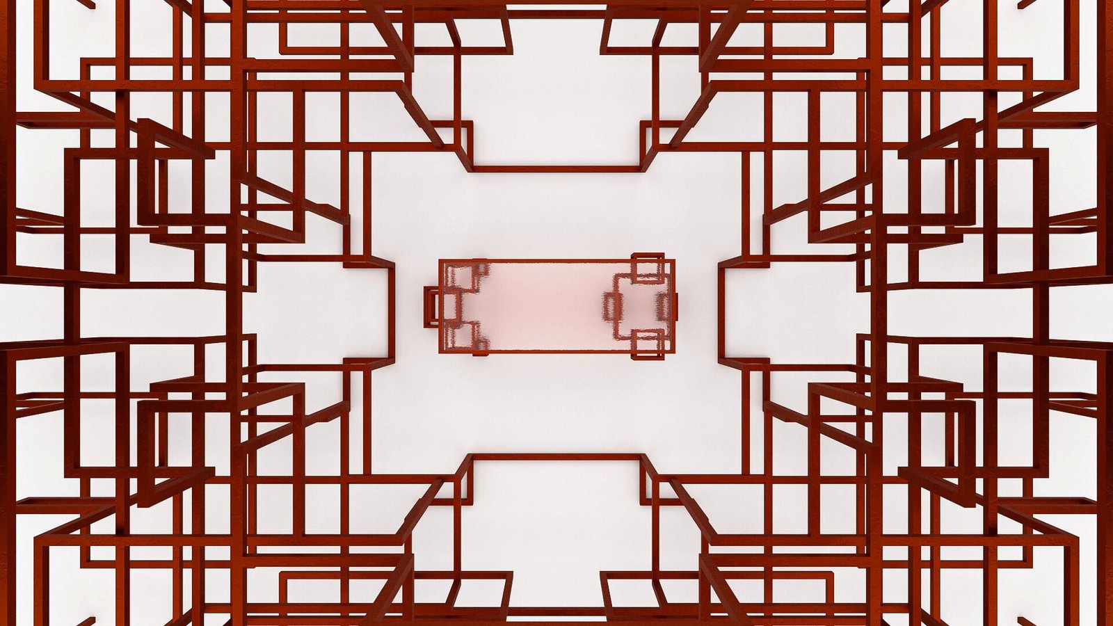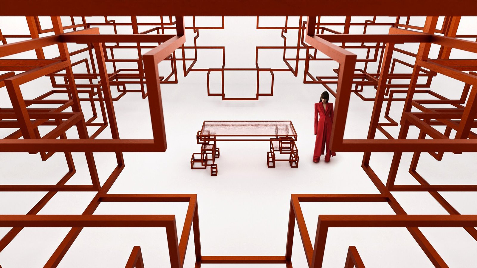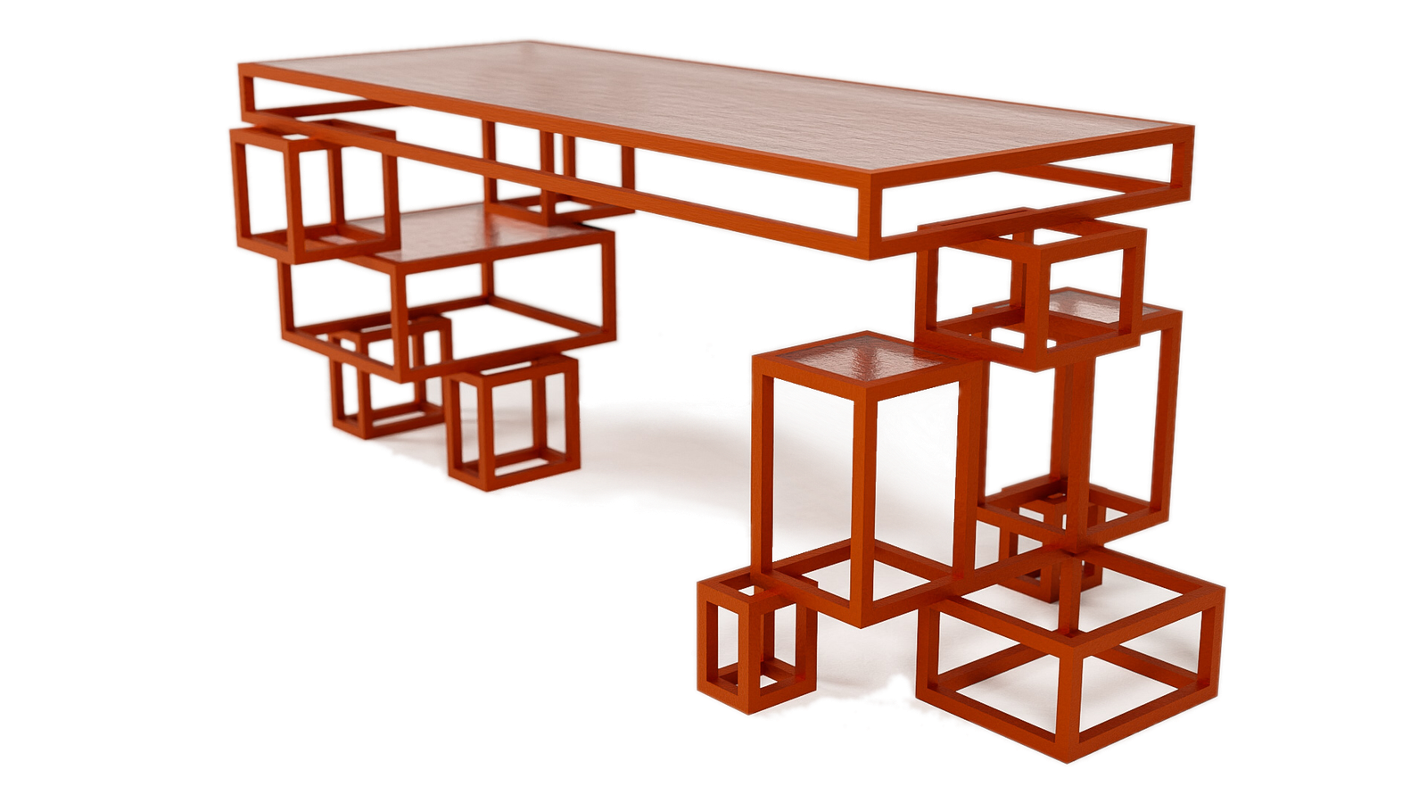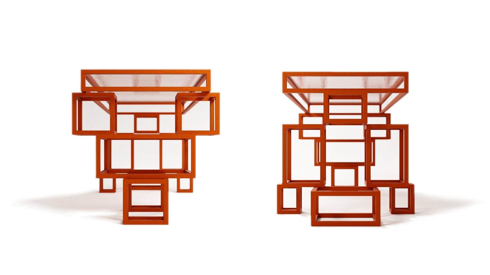 - Tabletop : Textured glass, chosen to maintain the view of the structure while offering a sensorial experience with its lightly red-tinted surface.